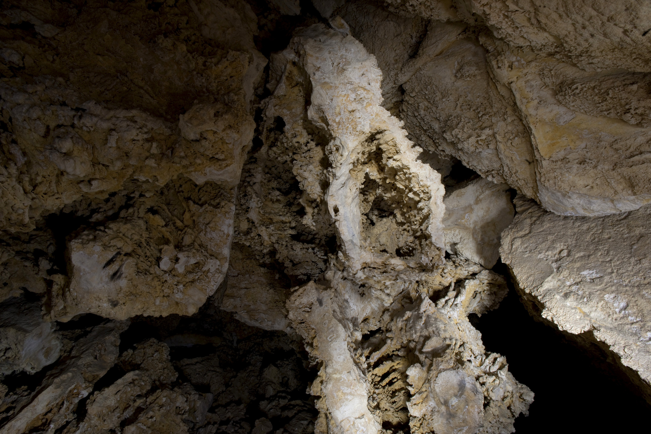 The largest Jurassic limestone cave system in the Czech Republic was created by underground water under the Turold Hill in the Pálava Highlands. The white walls in the corridor and fissure labyrinth of the Na Turoldu Cave are decorated, instead of by stalactites, by unique corrosive shapes similar to coral-reefs and stone foam with a number of holes, cavities and pealike growths as well as clusters of fine calcite crystals.