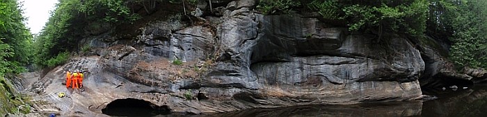 Young cave system formed from melting glaciers during the last ice age 10-13,000 years ago. Bedrock is 1.2 billion years old marble, with a large cave entrance (51 x 10 meter) known as the Stone Bridge as you can walk over the river on top of the cave. Most of cave system is underwater, but several surface caves have been surveyed, including Noisy Cave with a waterfall.